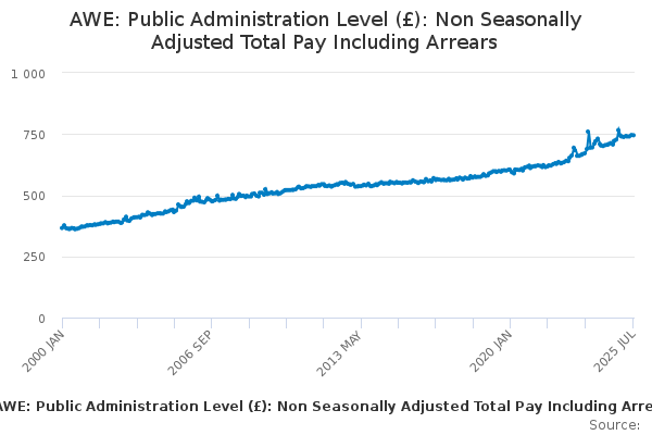Download this time seriesAWE: Public Administration Level (£): Non Seasonally Adjusted Total Pay Including Arrears