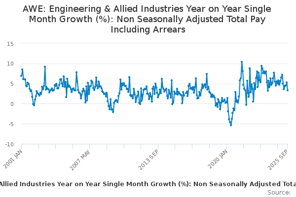 Download this time seriesAWE: Engineering & Allied Industries Year on Year Single Month Growth (%): Non Seasonally Adjusted Total Pay Including Arrears