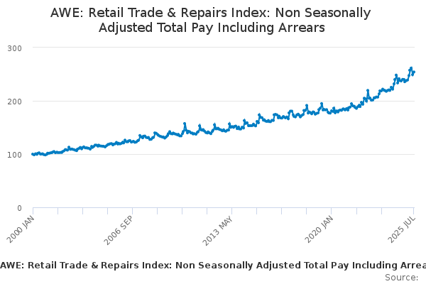 Download this time seriesAWE: Retail Trade & Repairs Index: Non Seasonally Adjusted Total Pay Including Arrears