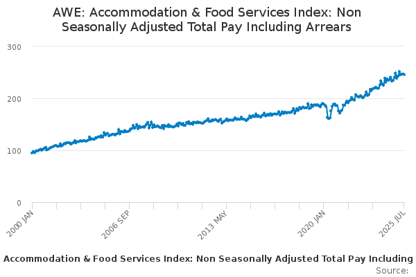 Download this time seriesAWE: Accommodation & Food Services Index: Non Seasonally Adjusted Total Pay Including Arrears