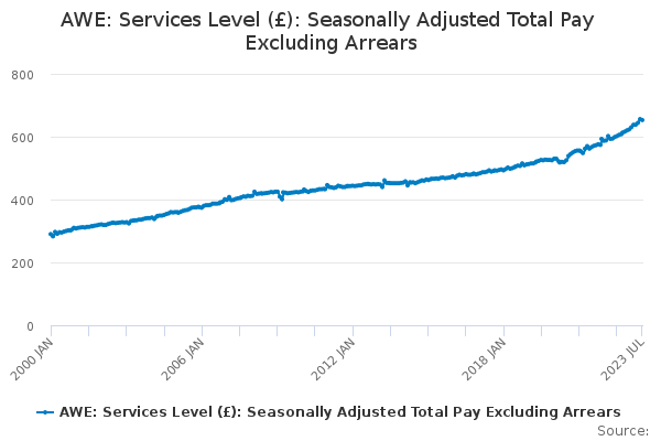 Download this time seriesAWE: Services Level (£): Seasonally Adjusted Total Pay Excluding Arrears