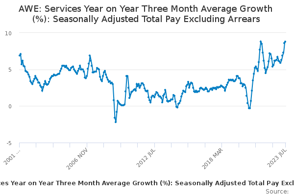 Download this time seriesAWE: Services Year on Year Three Month Average Growth (%): Seasonally Adjusted Total Pay Excluding Arrears