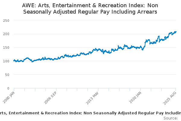Download this time seriesAWE: Arts, Entertainment & Recreation Index: Non Seasonally Adjusted Regular Pay Including Arrears