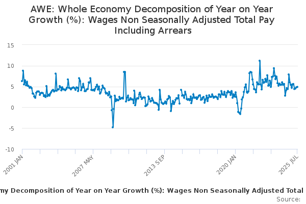 Download this time seriesAWE: Whole Economy Decomposition of Year on Year Growth (%): Wages Non Seasonally Adjusted Total Pay Including Arrears