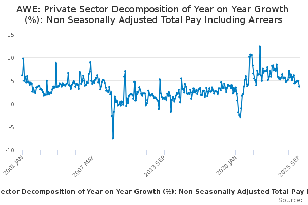 Download this time seriesAWE: Private Sector Decomposition of Year on Year Growth (%): Non Seasonally Adjusted Total Pay Including Arrears