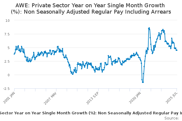 Download this time seriesAWE: Private Sector Year on Year Single Month Growth (%): Non Seasonally Adjusted Regular Pay Including Arrears
