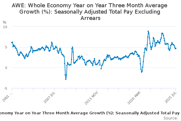 Download this time seriesAWE: Whole Economy Year on Year Three Month Average Growth (%): Seasonally Adjusted Total Pay Excluding Arrears