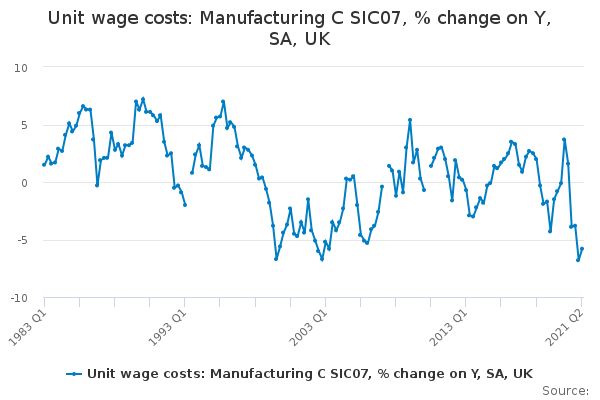 Download this time seriesUnit wage costs: Manufacturing C SIC07, % change on Y, SA, UK