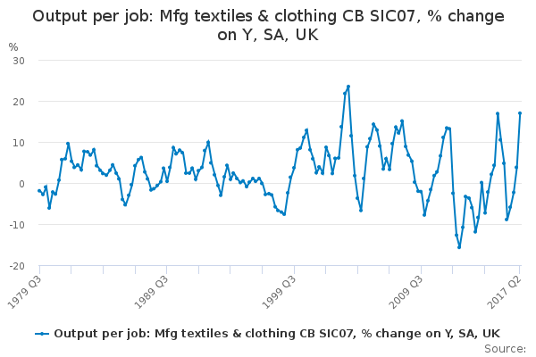 Download this time seriesOutput per job: Mfg textiles & clothing CB SIC07, % change on Y, SA, UK