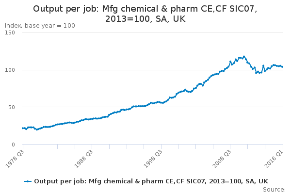 Download this time seriesOutput per job: Mfg chemical & pharm CE,CF SIC07, 2013=100, SA, UK