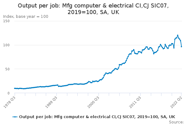Download this time seriesOutput per job: Mfg computer & electrical CI,CJ SIC07, 2019=100, SA, UK
