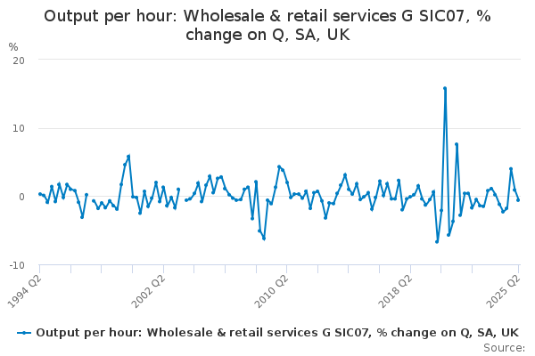 Download this time seriesOutput per hour: Wholesale & retail services G SIC07, % change on Q, SA, UK