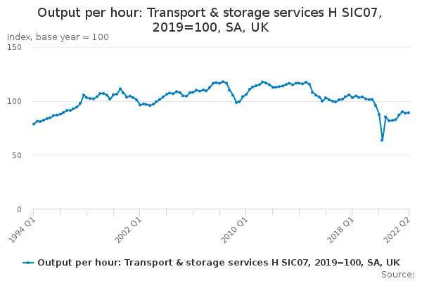 Download this time seriesOutput per hour: Transport & storage services H SIC07, 2019=100, SA, UK