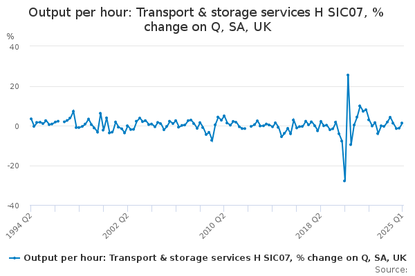 Download this time seriesOutput per hour: Transport & storage services H SIC07, % change on Q, SA, UK