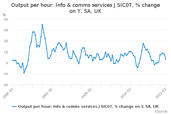 Download this time seriesOutput per hour: Info & comms services J SIC07, % change on Y, SA, UK