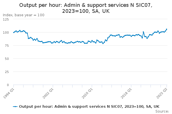 Download this time seriesOutput per hour: Admin & support services N SIC07, 2023=100, SA, UK