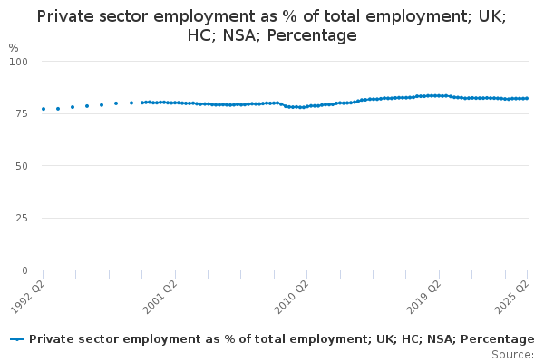 Download this time seriesPrivate sector employment as % of total employment; UK; HC; NSA; Percentage