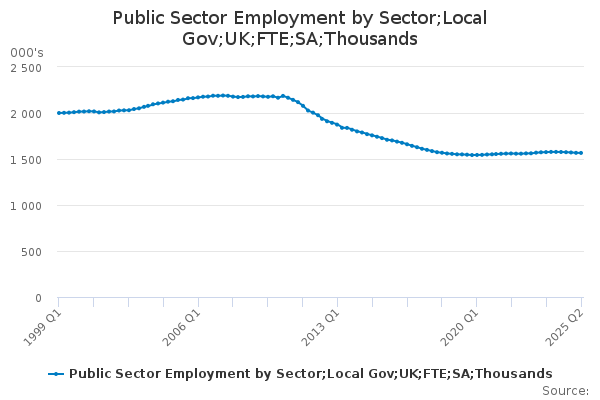 Download this time seriesPublic Sector Employment by Sector;Local Gov;UK;FTE;SA;Thousands