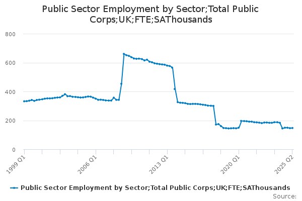 Download this time seriesPublic Sector Employment by Sector;Total Public Corps;UK;FTE;SAThousands