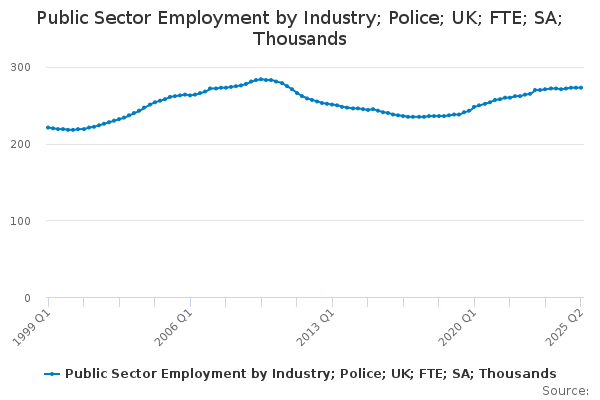 Download this time seriesPublic Sector Employment by Industry; Police; UK; FTE; SA; Thousands