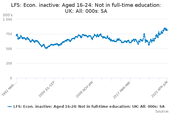 Download this time seriesLFS: Econ. inactive: Aged 16-24: Not in full-time education: UK: All: 000s: SA