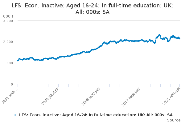 Download this time seriesLFS: Econ. inactive: Aged 16-24: In full-time education: UK: All: 000s: SA