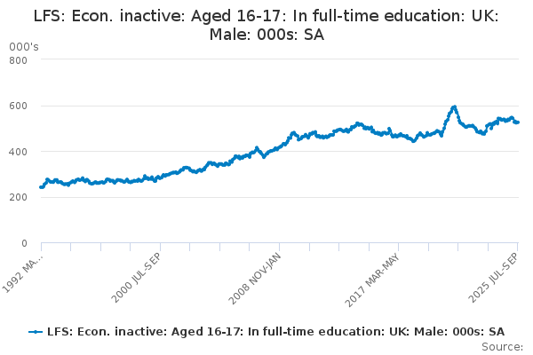Download this time seriesLFS: Econ. inactive: Aged 16-17: In full-time education: UK: Male: 000s: SA