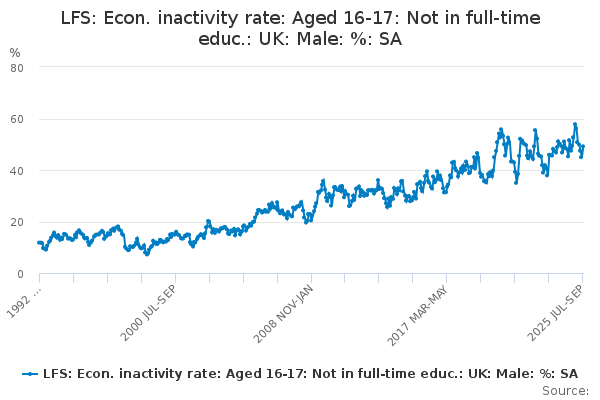 Download this time seriesLFS: Econ. inactivity rate: Aged 16-17: Not in full-time educ.: UK: Male: %: SA