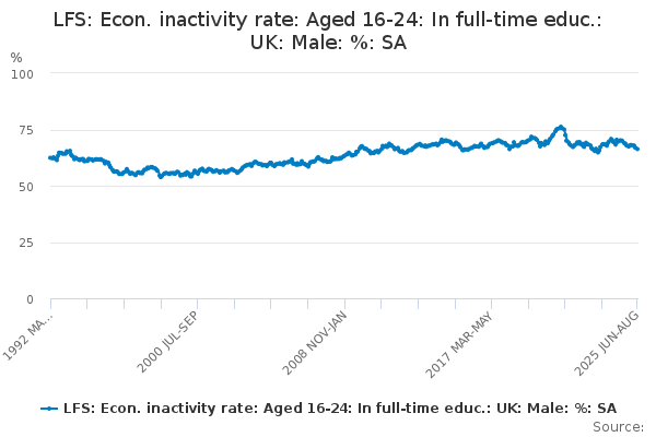 Download this time seriesLFS: Econ. inactivity rate: Aged 16-24: In full-time educ.: UK: Male: %: SA