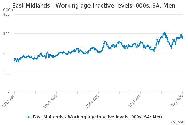Download this time seriesEast Midlands - Working age inactive levels: 000s: SA: Men