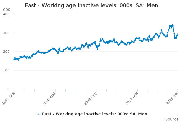 Download this time seriesEast - Working age inactive levels: 000s: SA: Men