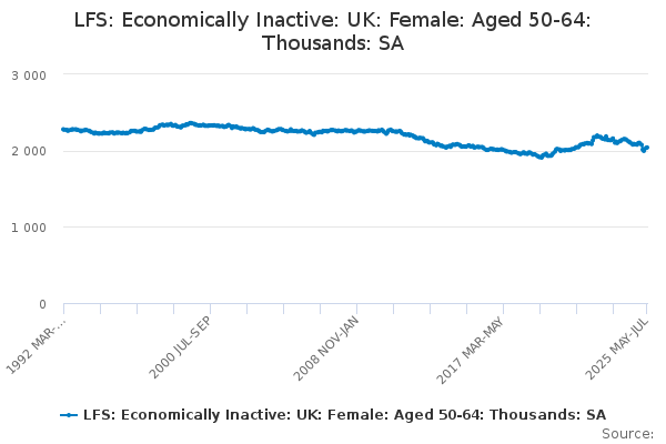 Download this time seriesLFS: Economically Inactive: UK: Female: Aged 50-64: Thousands: SA