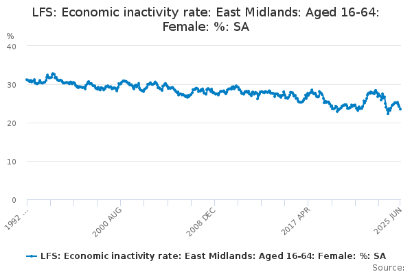 Download this time seriesLFS: Economic inactivity rate: East Midlands: Aged 16-64: Female: %: SA