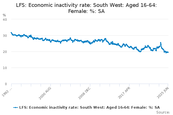 Download this time seriesLFS: Economic inactivity rate: South West: Aged 16-64: Female: %: SA