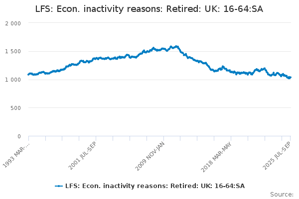 Download this time seriesLFS: Econ. inactivity reasons: Retired: UK: 16-64:SA