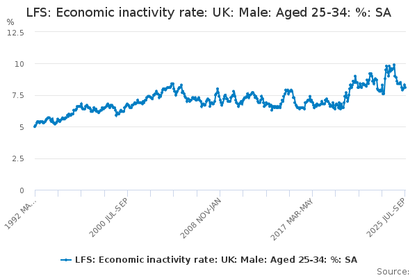 Download this time seriesLFS: Economic inactivity rate: UK: Male: Aged 25-34: %: SA