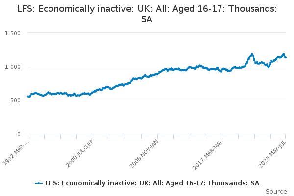 Download this time seriesLFS: Economically inactive: UK: All: Aged 16-17: Thousands: SA