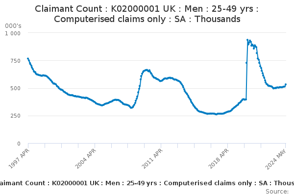 Download this time seriesClaimant Count : K02000001 UK : Men : 25-49 yrs : Computerised claims only : SA : Thousands