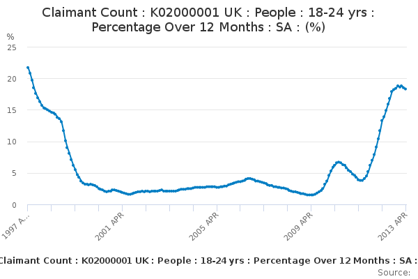 Download this time seriesClaimant Count : K02000001 UK : People : 18-24 yrs : Percentage Over 12 Months : SA : (%)