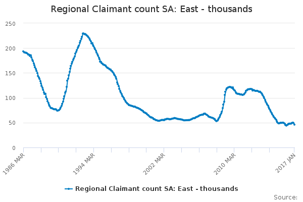 Download this time seriesRegional Claimant count SA: East - thousands