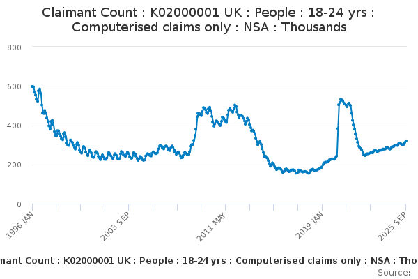 Download this time seriesClaimant Count : K02000001 UK : People : 18-24 yrs : Computerised claims only : NSA : Thousands
