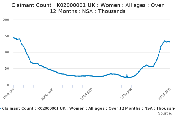 Download this time seriesClaimant Count : K02000001 UK : Women : All ages : Over 12 Months : NSA : Thousands