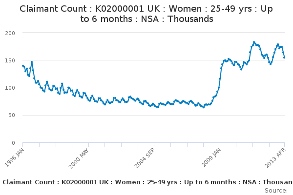Download this time seriesClaimant Count : K02000001 UK : Women : 25-49 yrs : Up to 6 months : NSA : Thousands