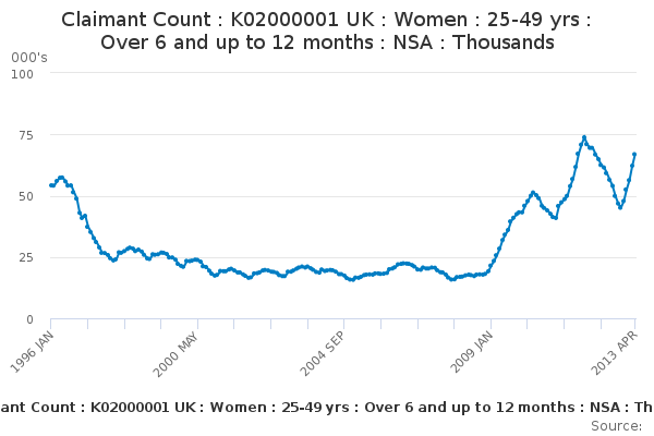Download this time seriesClaimant Count : K02000001 UK : Women : 25-49 yrs : Over 6 and up to 12 months : NSA : Thousands