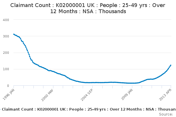 Download this time seriesClaimant Count : K02000001 UK : People : 25-49 yrs : Over 12 Months : NSA : Thousands