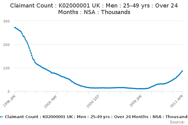 Download this time seriesClaimant Count : K02000001 UK : Men : 25-49 yrs : Over 24 Months : NSA : Thousands
