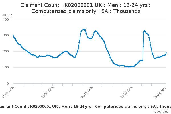 Download this time seriesClaimant Count : K02000001 UK : Men : 18-24 yrs : Computerised claims only : SA : Thousands