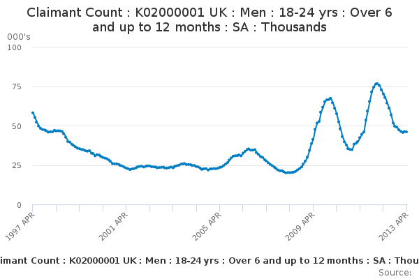 Download this time seriesClaimant Count : K02000001 UK : Men : 18-24 yrs : Over 6 and up to 12 months : SA : Thousands