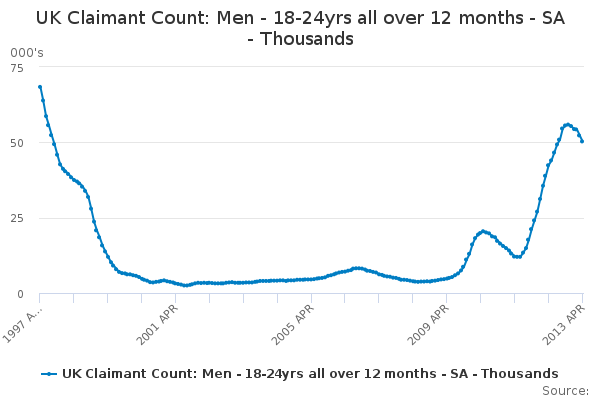 Download this time seriesUK Claimant Count: Men - 18-24yrs all over 12 months - SA - Thousands