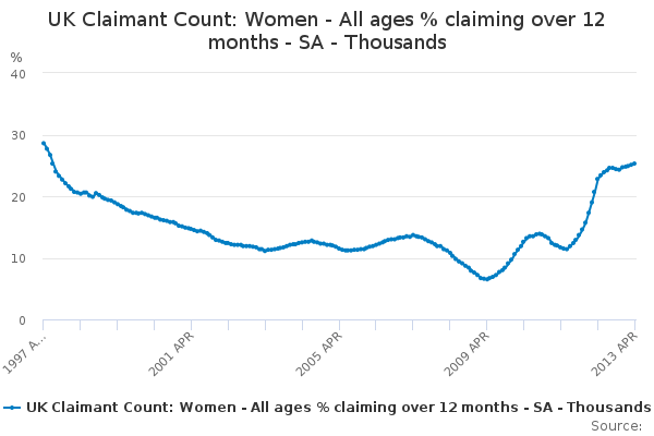 Download this time seriesUK Claimant Count: Women - All ages % claiming over 12 months - SA - Thousands